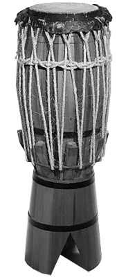 Sa base est plus fine que le sommet ou des crochets de fer (ces crochets peuvent être remplacés par des cordelettes) tendent un morceau de cuir de boeuf.