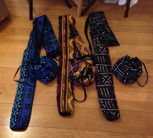 Housse de protection de berimbau rembourée avec emplacements pour y ranger baguette et dobrão ou galet. Motifs africains.